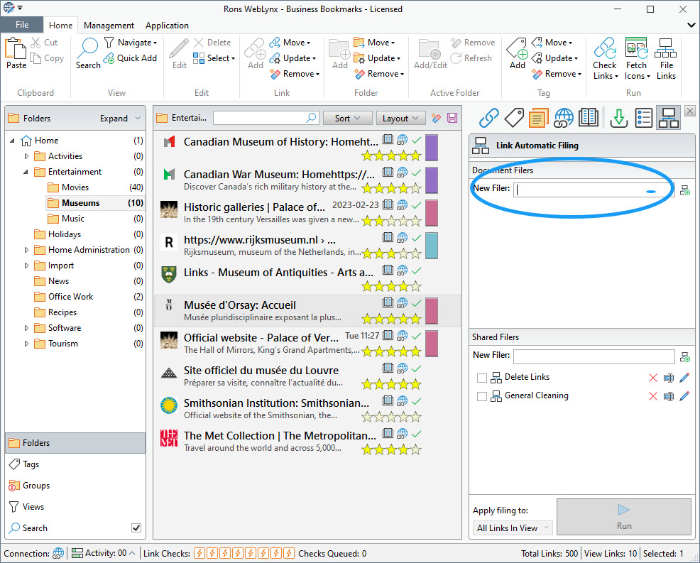 WebLynx contains a very powerful feature specifically designed to remove a large amount of work from organizing links, especially when those links come from chaotic sources such as web pages, search results or PowerPoint presentations. The feature is called Automatic Filing and is easily accessible from the side panel as shown below.